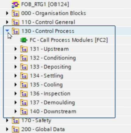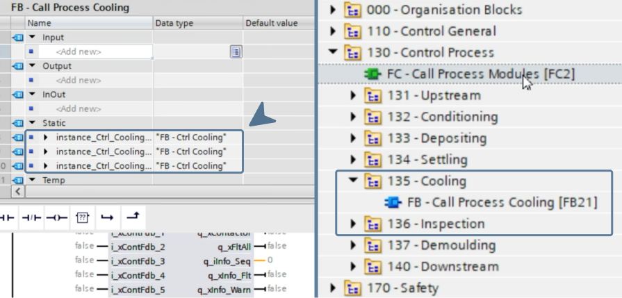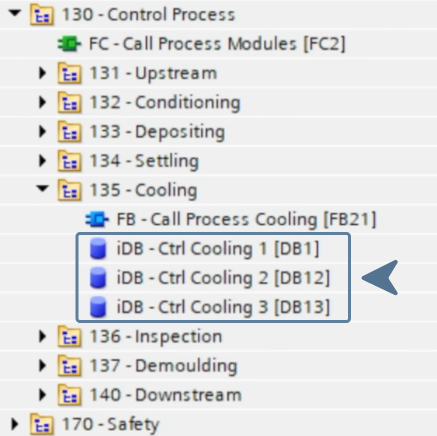 However, the setup isn’t complete yet. The main cooling block, "FB - Call Process Cooling", still needs to be called; otherwise, the three cooling blocks it contains will never be executed. This is done inside the parent block "FC - Call Process Modules", where "FB - Call Process Cooling" is called using a single instance named "iDB - Call Process Cooling".