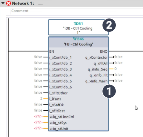 To show you how instances are created in TIA Portal, I've dragged a control block for cooling from the library group into Network 1.